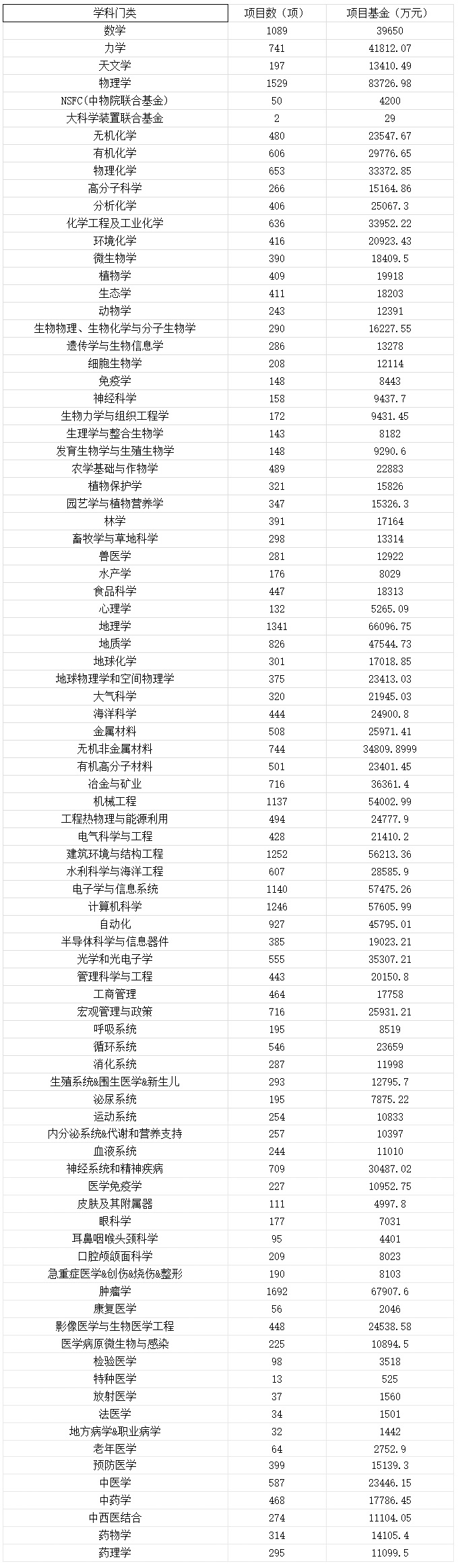表7 2016年自然科学基金项目学部分类表