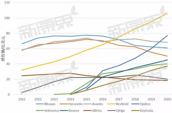 随着肿瘤患者逐年增加,抗肿瘤药物市场也成为近年来医药界关注热点。最新统计显示,全球最畅销的100个药物中抗肿瘤药物有20个。下面来盘点一下未来5年最畅销抗肿瘤药物TOP10,其中既有风骚多年的罗氏三巨头单抗,有持续坚挺的来那度胺,有新型靶向小分子抗癌药物,更有近年来异军突起的PD1抑制剂类药物。![]() ![]() TOP1 Revlimid 来那度胺 来那度胺是新基(Celgene)开发的新一代抗肿瘤药,主要用于治疗骨髓增生异常综合症和多发性骨髓瘤。它的治疗效果那度胺已获得全球范围内医生和患者的广泛认可。 今年7月份欧盟委员会批准Revlimid用于治疗复发或者难治的套细胞淋巴瘤,FDA批准用于治疗复发或者至少接受过两次治疗的套细胞淋巴瘤;7月份Revlimid用于一线治疗弥散性大B细胞淋巴瘤的III期临床研究也已经结束,其适应症范围将进一步扩大。 来那度胺上市后增长迅速,2015年销售额达58亿美元,而2016年上半年达32.74亿美元,预计2016年销售额将到68亿美元,到2020年它有望成为首个销售额超过百亿美元的抗肿瘤药物,是当之无愧的未来5年最畅销抗肿瘤药物TOP1。 值得一提的是,国内双鹭制药的来那度胺于2016年4月被CFDA纳入优先审批程序,一旦获得批准就表示双鹭的来那度胺成功打破新基来那度胺专利壁垒。 TOP2 Avastin 阿瓦斯汀 阿瓦斯汀作为一种抗血管生成的药物,通过抑制血管内皮生长因子的作用阻断肿瘤,抑制肿瘤在体内扩散,增强化疗疗效。在批准用于治疗乳腺癌前,这种药物还被美国药管局批准用于治疗肺癌、结肠癌和直肠癌,并在欧洲获准用于治疗乳腺癌、结肠癌和直肠癌。相对于赫赛汀和美罗华,阿瓦斯卡面对的生物仿制药竞争不是很大,前二者在欧洲的专利都已到期,而阿瓦斯汀可以被保护到2022年。2016上半年年销售额为35.74亿美元,同比增长了4%,预计未来几年还有一定的上涨空间。 TOP3 Rituxan 美罗华 美罗华是一种抗CD20单克隆抗体,适应症广泛,用于治疗各种血液肿瘤,还可用于二线治疗类风湿性关节炎,它已连续多年蝉联抗肿瘤药物销售冠军的宝座,不过今年应该就是它的销售巅峰了。此药专利在美国将于2016年9月22日到期,一大波仿制药一旦袭来,美罗华的销量势必会大大下跌。罗氏为此推出了一款新药Gazyva来应对生物仿制药的挑战,今年6月罗氏发布了Gazyva针对滤泡性淋巴瘤最新头对头临床试验结果,显示与美罗华相比,Gazyva能够显著延长既往未接受过治疗的滤泡性淋巴瘤患者的无进展生存期,达到了III期临床试验Gallium的主要终点。2016年上半年销售额为38.28亿美元,同比上升了5%。 TOP4 Herceptin 赫赛汀 赫赛汀是治疗HER2阳性弥散性乳腺癌的黄金标准,最近几年的年销售额一直维持在60亿美元以上,但增长空间有限,市场已达到饱和,美国专利将于2019年到期。就此,罗氏推出了取代赫赛汀的药物——Perjeta,用于抵抗生物仿制药的竞争,但临床研究结果表明Perjeta对HER2阳性的乳腺癌治疗效果并不比赫赛汀优秀,其增长潜力并未达到预期效果。赫赛汀2016年上半年销售额为35.51亿美元,同比增长5%。预计2017年后受仿制药竞争影响,将出现销量下滑。 TOP5 Opdivo 纳武单抗 Opdivo 是百时美施贵宝推出的一款新型的PD-1抑制剂类靶向抗肿瘤药物,是被各路人士看好的一款重磅药物。从2014年以来,它被批准上市的适应症已经多达4个,分别是复发难治的经典型霍奇金淋巴瘤;二线治疗不可切除的黑色素瘤;二线治疗非小细胞肺癌;已经晚期或者转移的肾细胞癌。另外还在两个适应症上获得突破性治疗药物资格:头颈部鳞状细胞癌和尿路上皮癌。Opdivo广泛被认为在竞争激烈的PD-1抑制剂类新型抗肿瘤药物中处于领先地位。而它的销售额也证明了这一点,自2014年上市后销售额直线上升,今年上半年销售额为15.44亿美元,几乎是去年同期的10倍,预测到2022年时其峰值年销售额或将超过100亿美元。 TOP6 Ibrance Ibrance 是辉瑞研发的一种口服性抗CDK抑制剂,可用于治疗各种癌症,它是全球首个CDK4/8抑制剂。2015 年 2 月 3 日,FDA批准Ibrance用于一线治疗 ER+/HER2- 绝经后晚期乳腺癌;2016年4月,FDA批准Ibrance用于二线治疗治疗ER+/HER2- 绝经后晚期乳腺癌,此次获批将显著扩大Ibrance的患者群体。2016年1月Ibrance被英国药品与健康产业管理局(MHRA )授予“重大创新新药”资格,这意味着Ibrance离进入英国药物快速审批通道EAMS更近了一步,进入英国市场也指日可待。业界对Ibrance的商业前景也十分看好。此前,全球医药行业调研机构GlobalData发布报告指出,辉瑞CDK4/6抑制剂Ibrance将主导HR+乳腺癌。2015年Ibrance 销售量达14.43亿美元,2016年上半年为9.42亿美元,预计销售峰值将超过50亿美元。 TOP7 Imbruvica 依鲁替尼 依鲁替尼是一款新型的BTK酶抑制剂,是由强生和艾伯维共同研发,已被FDA批准用于治疗套细胞淋巴瘤、慢性淋巴细胞白血病、非霍奇金淋巴瘤等,6月份被欧盟批准用于治疗慢性淋巴细胞白血病。处于后期临床研究的适应症包括:弥漫性大B细胞淋巴瘤、滤泡性淋巴瘤、胰腺癌。艾伯维和强生对此药及其乐观,称Imbruvica的年销售峰值可望达到115-120亿美元,这虽然有点过于夸张,但依鲁替尼表现确实强劲,2015年销售为14.43亿美元,2016年上半年销售额已达到13.76亿美元。观察家们预期此药销售峰值可达50亿美元。 TOP8 Keytruda Keytruda是默沙东推出的一款抗PD1单克隆抗体,也是BMS的Opdivo强有力对手,二者在PD1抑制剂市场上的竞争也颇有看点