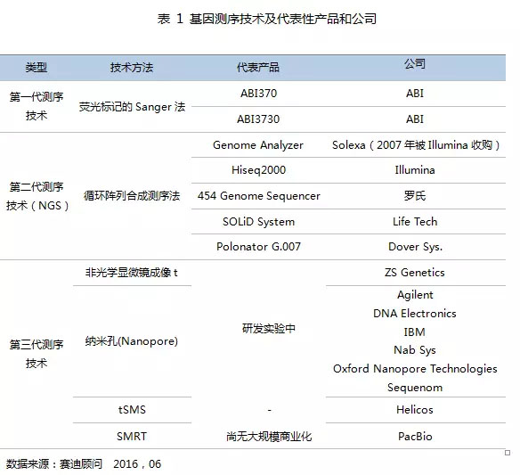 基因测序仪的技术壁垒高,基本被国外企业所垄断。基因测序仪处于整个基因测序产业链的顶端,也是价值链最高的部分。全球基因测序仪市场已经被Illumina、Life Technology和Roche(罗氏)所垄断,三家公司近乎掌控全球整个基因检测产业的上游决定权。我国在测序仪领域不断加大研发投入,试图打破测序仪市场现有的垄断局面,但是还存在技术问题有待于突破。华大基因于2013年投入1.18亿美元收购美国的Complete Genomics公司,并推出BGI-SEQ 500测序仪和Revolocity系统(处于暂停交付状态)。