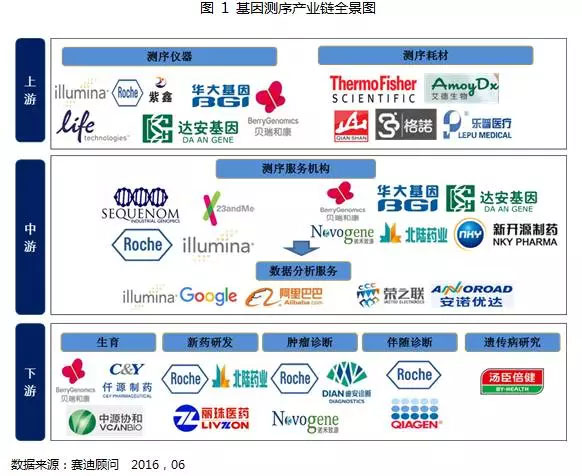 一、基因测序是精准医疗产业发展的基础,也是精准医疗产业商业化应用比较成熟的领域 基因测序仪是基因测序产业链的关键环节。基因检测上游是测序仪器与试剂耗材,中、下游是基因测序服务与生物信息学分析,面向医院、制药公司、科研机构以及消费者等群体。基因测序仪是测序产业链的起点也是关键环节,它为整个中下游测序服务提供最基本的测序支撑。