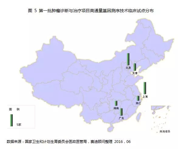2015年3月,卫计委医政医管局发布第一批肿瘤诊断与治疗项目高通量基因测序技术临床试点单位名单。上海、北京、广东、天津由于拥有国内基因检测领域领军企业和众多高水平科研机构,具备着较高水平的基因检测技术以及配套人才,成为基因测序技术应用于肿瘤诊断与治疗的临床试点。