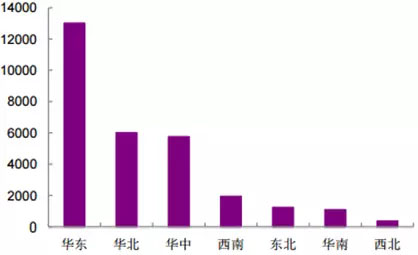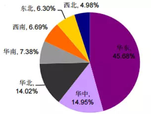 我国冷库储藏商品品类占比 根据数据统计,国内华东区域的冷库保有量最大,合计达900万吨,占比超过45%。我国冷库的整体建设发展失衡,主要分布在北京、上海等一线城市,而西北片区等内陆城市的分布相对较少。