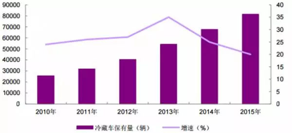 2010~2015 年我国公路冷藏车保有量及其增速 冷藏车的保有量中大约有3万辆自有冷藏车,5万多辆社会冷藏车。冷藏车在国内区域保有量分布中呈现出与冷库类似的格局,华东等地区自有冷藏车密度普遍较高,这些地区普遍经济也比较发达,居民生活水平、消费水平偏高,对食品质量和安全也更为重视。