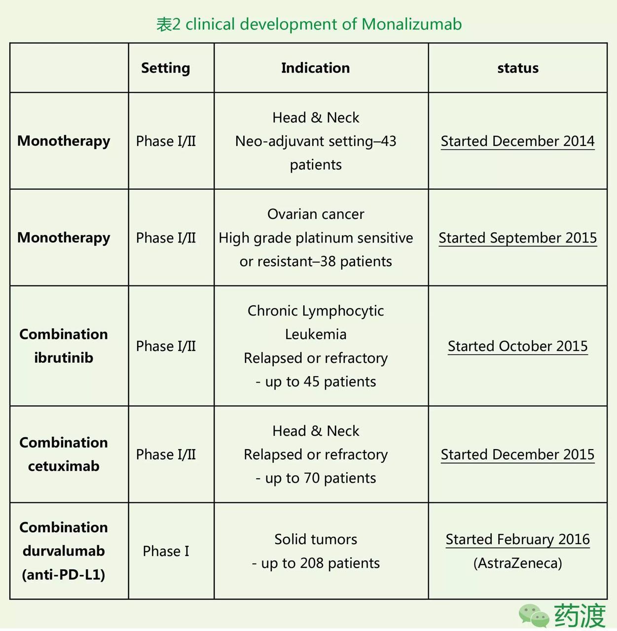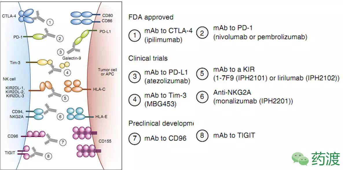 鉴于此,Innate Pharma成了最早吃螃蟹的人,并在2007年开始使用KIR抗体治疗恶性血液癌。在2011年以总计4.4亿美元的高价将anti-KIR单抗 (lirilumab)授权给了BMS做后期临床开发,随后BMS放手一搏,围绕lirilumab同时开展了七个临床试验(附表2)。然而在单独使用lirilumab治疗多发性骨髓瘤的二期临床试验中,并没有达到预期的效果。尽管如此,BMS仍然义无反顾的推进联合使用的临床试验,确信在联合使用中会收到更佳的疗效。不久之后,Innate Pharma更以高达12.7亿美元的总价把靶向CD94/NKG2A的Monalizumab单抗转让给了阿斯利康,阿斯利康也不甘示弱,围绕Monalizumab同时开启了5项临床试验(附表3)。除NK细胞本身特异性受体外,还表达有其同T细胞共有的checkpoint inhibitors (图2),包括现在最火热的PD-1抗体。