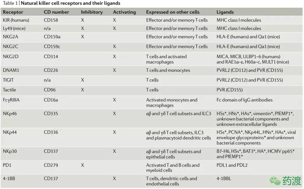 为方便后文的理解,我们先浏览一下NK细胞主要配体和受体以及主要作用机理(表1 所示)。