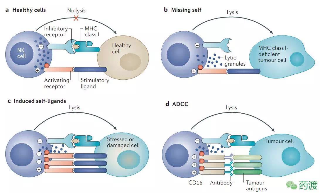 在人体内NK细胞主要特征为CD3-CD56+淋巴细胞群,其中血液中主要为CD16+CD56dim亚型。NK细胞作为天然免疫系统的重要组成部分,在清除衰老细胞、病原微生物入侵时发挥着重要作用。由于NK细胞不同于T细胞和B细胞,缺少更多的基因重排过程。因此NK细胞不像T细胞一样通过特异性TCR识别靶细胞,而是通过胚系基因表达的受体识别靶细胞。为了避免对健康组织细胞造成误伤,NK细胞通过表达KIRs (immunoglobulin(Ig)-like receptors)、CD94–NKG2和MHCI-peptide结合来负调控活性。当NK细胞识别MHC所呈递peptide为自身抗原肽时,启动抑制信号,阻止NK对自身健康细胞的杀伤(图1-a)。一旦肿瘤细胞或其他损伤的细胞为逃逸获得性免疫追杀而下调MHC消除抑制信号,NK细胞恰好可以通过某些激活信号杀伤靶细胞(missing self) (图1-b)。即使存在抑制信号,NK细胞也可以通过启动强激活信号通路,来激活NK细胞杀伤靶细胞(图1-c)。NK细胞直接通过肿瘤细胞表面富集的IgG抗体启动ADCC功能,直接杀伤肿瘤细胞,ADCC也是NK细胞杀伤靶细胞的主要方式(图1-d)。