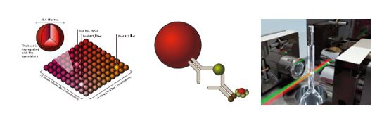 图2 检测对象越丰富疾病区分度越好(class代表指标分类,marker代表具体指标) 目前,实现肿瘤标志物联合检测的最便捷最高效的技术手段之一就是xMAP技术。xMAP技术基于不同荧光编码的微珠。每一种编码微珠标记一种可捕获相应目标分子的抗体,根据检测靶标的数量,选择1-100种标记的微珠,混合后与样品中待测的靶标分子作用,然后在液流驱动下逐个通过检测窗口,两束不同波长激光对每个微球进行检测,635nm激光检测微球的色标编码从而确定检测的靶标,532nm激光检测相应靶标上的荧光标记进行定量,通过计算机分析和标准曲线拟合,直接对每一种目标分子进行定量。该技术利用Luminex多功能液相芯片平台实现了对蛋白、核酸等靶标分子的多重检测,是唯一被纳入美国临床实验室质控的高通量技术,被誉为真正的临床型生物芯片。 图3 xMAP技术原理图 视频1:xMAP技术原理及Milliplex技术平台介绍 基于xMAP技术的多重检测平台的优势: