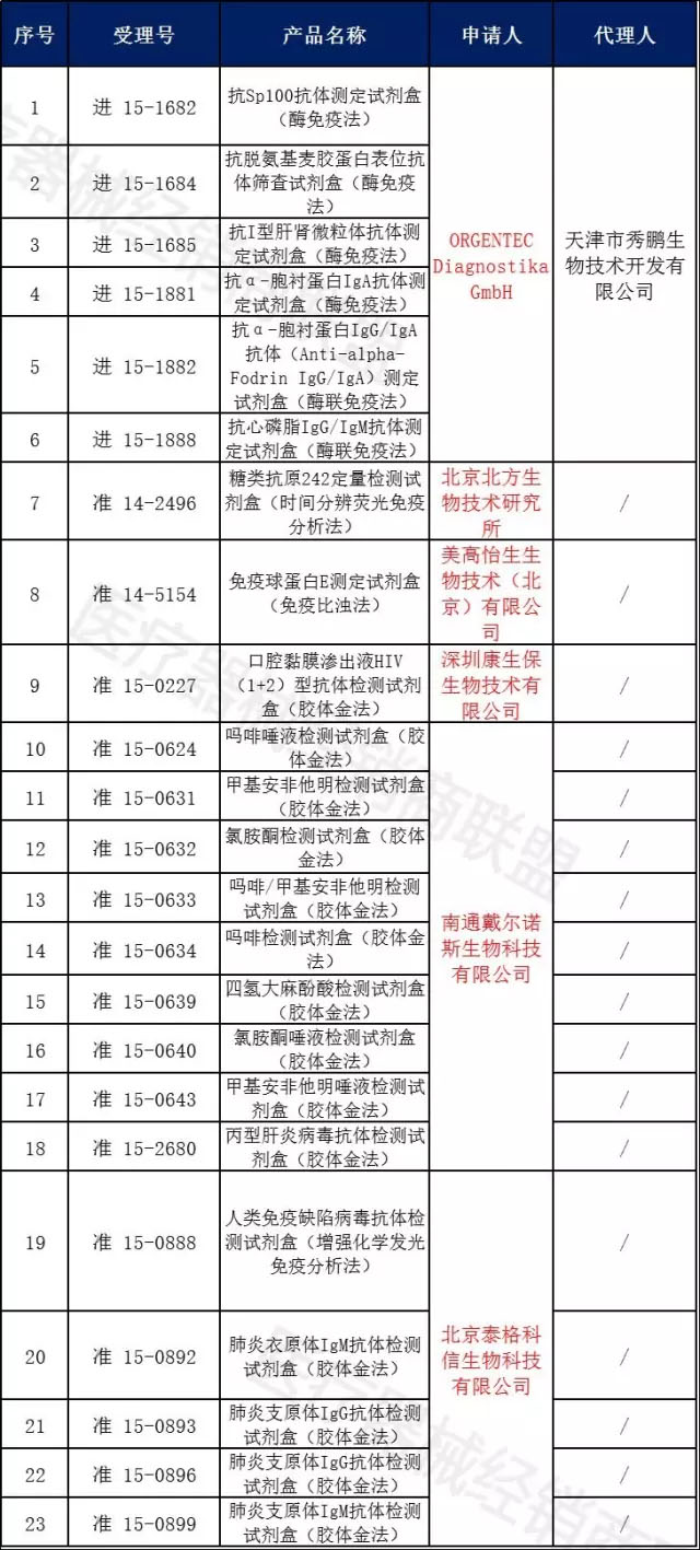 本次被总局毙掉产品全部属于体外诊断试剂,分别来自六个公司:ORGENTEC Diagnostika GmbH、北京北方生物技术研究所、美高怡生生物技术(北京)有限公司、深圳康生保生物技术有限公司、南通戴尔诺斯生物科技有限公司、