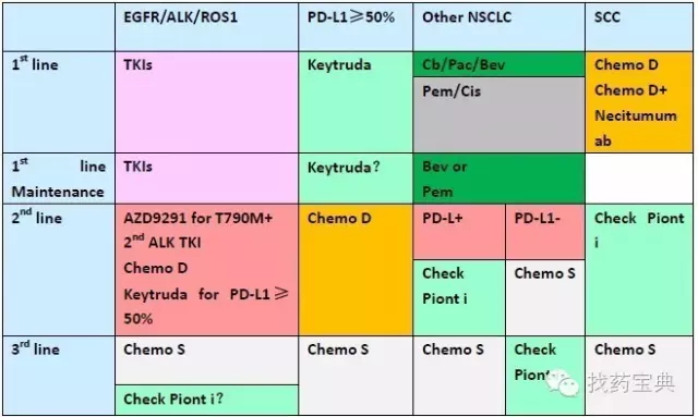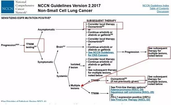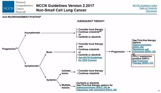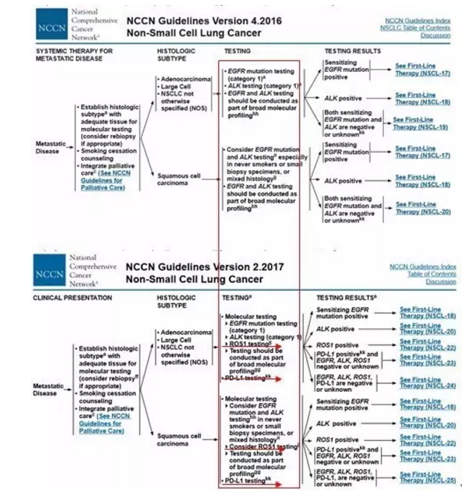 ![]() 近日公布的2017版NCCN指南焕然一新,靶向及免疫治疗的飞速进展彻底改变了我们延习多年的NSCLC治疗模式。尤其是在晚期非小细胞肺癌的治疗流程及一线进展后临床处理上,展现出了很多新面孔。下面就以2016.4版及2017.2版的NCCN指南对比来详细解析。 一、晚期非小细胞肺癌一线治疗更新——ROS1与PD-L1 ![]() 众所周知,在包含2016版之前的版本中,对于晚期NSCLC特别是非鳞非小细胞肺癌需要常规检测EGFR/ALK基因的突变情况,对于突变阳性的患者一线推荐使用TKI类靶向药物。而2017版中赫然多了ROS1基因的融合检测及PD-L1的表达检测。将患者人群更加细分化,提出新的一线治疗理念。 (1)对于ROS1重排阳性的患者,一线推荐克唑替尼用药,病情进展后可以进行化疗或PD-1的免疫治疗。 ![]() (2)对于PD-L1表达≥50%的EGFR/ALK/ROS1阴性的患者,一线可以直接选用PD-1单抗KEYTRUDA用药。治疗失败后可更换化疗。 ![]() 晚期NSCLC的一线治疗一分为三,一条以驱动基因为基础的靶向治疗之路,此为首选。另一条是在无驱动基因下对PD-L1检测,若高表达(≥50%),可以使用keytruda ;第三条,没有任何适应症的患者可以一线化放疗。 二、EGFR基因突变的二线治疗——T790M靶向药物Osimetinib(AZD9291) EGFR TKI类药物易瑞沙、特罗凯曾经在肺癌治疗史创下一段传奇,而TKI的耐药也成为了临床处理的常见难题之一,对于这种有明确驱动基因的肺癌类型在一线TKI治疗失败的情况下即放弃靶向之路转为化疗的临床处理实属可惜。而针对T790M继发耐药突变的靶向药物AZD9291成功地延续了EGFR的神话。其在二线甚至是一线上展现出的临床疗效在2017版的指南中得到了公认。 两图对比可见,对于TKI耐药进展的患者,2017版中直接要求检测T790M的突变状态,对于有症状的多发进展患者直接使用Osimetinib (AZD9291),其他T790M阳性的缓慢进展患者在附一局部治疗外可以直接选用Osimetinib,也可以进行一代TKI的沿用,但在进展后可再次使用Osimetinib。相信随着Osimetinib(AZD9291)的普及,其对于T790M的患者的一线二线三线治疗将形成垄断治疗模式。 ![]() ![]() 三、免疫治疗 免疫治疗的突破发展在新版的NCCN指南中展现无余,除了之前提到的对于PD-L1≥50%的晚期NSCLC可以一线使用PD-1单抗外,在化疗、靶向治疗失败的二线及三线治疗上都可以看到PD-1单抗的身影。 1.化疗失败后选用PD-1单抗 ![]() 2.EGFR靶向治疗失败后选用PD-1单抗 ![]() 3.ALK靶向治疗失败后选用PD-1单抗 ![]() 4.ROS1靶向治疗失败后 ![]() 免疫治疗已成为化疗及靶向治疗失败后患者的有力选择,但与2016版不同的是,除了化疗失败后可直接选用PD-1单抗nivolumab或Keytruda外,EGFR/ALK/ROS1靶向治疗失败后的患者在选用PD-1单抗时要求肿瘤PD-L1高表达(≥50%),增加了药物适用人群的筛选,这基于临床试验数据及opdivo的一线失败的经验教训,适度避免了免疫药物的泛滥使用。 |
