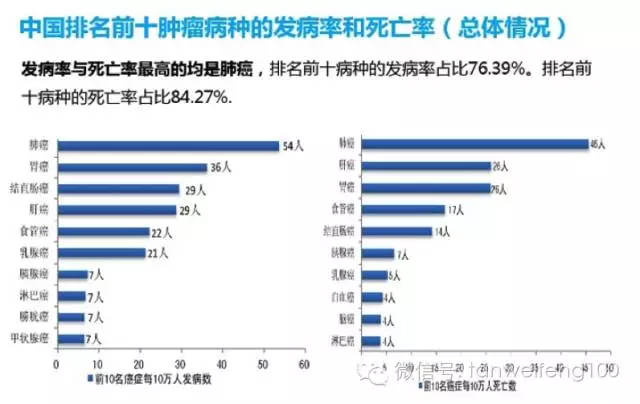 近年来,我国肿瘤发病率和死亡率持续增高,成为危害国民健康的主要杀手,肿瘤发病率的高涨导至抗肿瘤药物市场增速明显,也为居民和国家造成严重的经济负担。各大医疗机构和部分社会资本开始加大对肿瘤科室、肿瘤医院的投入,国内外抗肿瘤药企也纷纷加大新药研发的力度和对中国市场的关注,医保和商保等第三方支付平台积极寻找适合肿瘤患者创新的报销和补偿模式。互联网医疗也开始介入肿瘤市场施展拳脚,患者社区,医患互动,肿瘤大数据,医患服务平台等领域发展迅速,逐步解决信息不对称,资源不匹配等问题,完善肿瘤市场布局,为医生和患者提供更加优质的服务。在这里,我们把中国肿瘤行业的主要数据和发展动态进行梳理,希望帮助大家理解这个行业的发展方向和趋势。 发病和死亡 全球癌症负担正在以惊人的速度加重,平均每8个死亡病例中就有1人死于癌症,预计未来20年全球每年新增癌症病例将达到2200万,同期癌症死亡人数也将飙升至1300万。其中,发展中国家的癌症数量不断攀升,60%的病例发生在非洲、亚洲和中美洲及南美洲地区,占全世界癌症死亡数的70%。 随着我国人口老龄化趋势的到来,以及工业化带来的环境污染和城市化等因素带来的生活习惯改变,近年来我国居民的肿瘤发病率和死亡率明显提高,恶性肿瘤已经超过心脑血管疾病,成为我国居民的头号杀手,占死亡比例25%以上。全国肿瘤登记中心数据显示,在中国每年每十万人中有264人患癌,一生中22%的概率患癌症;每年每十万人有192人患癌死亡。我国常见的恶性肿瘤主要包括非小细胞肺癌,乳腺癌,结直肠癌,胰腺癌,原发性肝癌,前列腺癌等,病人数目及结构呈现出“更多、更早期、更年轻”的趋势。中国排名前十的肿瘤病种发病率、死亡率总体情况如下图显示。值得注意的是,中国肿瘤患者的5年生存率在30%左右,远远落后于美国和日本的60%,可见中国肿瘤防治态势非常严峻。