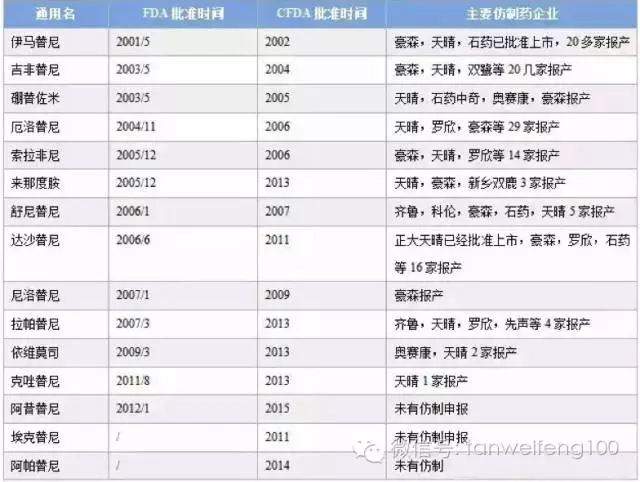 国内药品市场和肿瘤新药 2020年中国药品市场规模预期将达1500-1800亿美元,将占有全球11%的市场,接近欧洲前五国家总和。肿瘤药品市场近五年内年均增长率超过15%,明显高于总体医药市场增长速度。受发病率不断攀升和目前药品疗效局限性的驱动,抗肿瘤药物已成为制药行业的一大热门。其中免疫疗法和分子靶向药物是研发的重点方向。就在最近的一年里FDA已经分别批准了施贵宝、默沙东、罗氏的的多个PD-1/L1在不同的实体肿瘤里的应用。未来肿瘤免疫疗法市场预估超500亿美金(2022年)。 国内已上市的进口原研药已经有国产伊马替尼、达沙替尼和吉非替尼的仿制药获批国内上市,然而,每一个在国内已上市的小分子靶向药物原研药,均有多家国内企业扎堆报产仿制,竞争非常激烈。仿制小分子靶向药物的企业高度集中,天晴,豪森,罗欣,石药等是申请清单上的常客,跟进国外产品进度,仿制进度越来越快。近年来,媒体曾经报道过全球知名药企百时美施贵宝和再鼎医药有限公司宣布双方达成战略联盟,在中国共同开发治疗肝细胞癌制剂布立尼布;海南海药子公司重庆天地药业责任有限公司正在提取加工抗肿瘤药紫杉醇,新一代抗癌药物苯达莫司汀已处于临床试验阶段,后续还会有新的品种研发上市;上海医药和北大医药等都有意向通过收购等,整合抗肿瘤药产业链,实现公司在肿瘤医疗服务中的战略布局。在各种政策频繁出台与市场格局不断变化的时势下,中国的医药研发将迎来新的发展,新药上市后必将面临激烈的竞争,届时对于企业的临床推广能力将具有非常大的考验。下图显示了国外肿瘤药物在中国的仿制和申报情况。