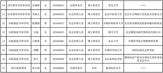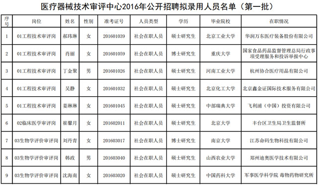 2016年11月22日,国家食品药品监督管理总局医疗器械技术审评中心发布2016年公开招聘拟录用人员(第一批)公示公告,拟录用17人。公示期自2016年11月22日至11月30日。公示期间,如对人选有异议,请向CMDE人事部门反映,监督电话:010-68390695、68390697。拟录用人员公示信息如下: