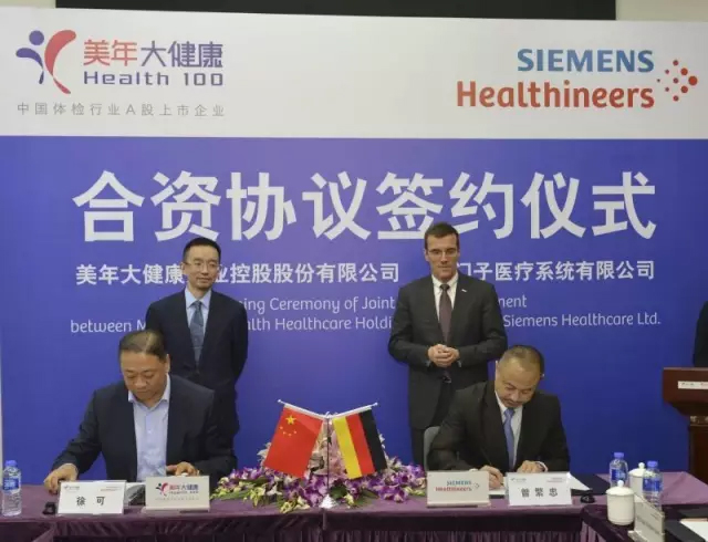 昨日(12月1日),西门子医疗系统有限公司(以下简称“西门子医疗中国”)与美年大健康产业控股股份有限公司(以下简称“美年大健康”)共同宣布,双方签署协议,将共同设立与运营一家独立医学影像诊断中心。美年大健康产业控股股份有限公司董事长俞熔、总裁徐可、西门子医疗全球首席运营官Michael Reitermann和西门子医疗大中华区总裁曾繁忠出席签约了仪式。 同日晚间,在深交所上市的美年大健康发布《关于与西门子医疗系统有限公司合资设立公司的公告》,根据公告,西门子医疗将与美年大健康合资设立上海美熙医学诊断有限公司(暂定名),总投资额为人民币 1亿元,其中美年大健康拟以自有资金出资人民币 5100 万元,持有合资公司51%的股权;西门子医疗拟出资人民币 4900 万元,持有合资公司49%的股权。 合资公司将设董事会,董事会将由5名成员组成,其中3名成员(包括董事长)由美年健康委派,另外2名成员由西门子医疗委派,双方各有权提名1名监事。总经理由美年健康提名,财务总监1名由西门子医疗提名。 另据医谷了解,该中心未来将落户上海,占地面积约3000平方米,将利用影像诊断、体外诊断等先进设备以及其他医疗产品,从事影像诊断、健康检查与体外诊断等业务。 2016年8月12日,国家卫生计生委对外正式印发《医学影像诊断中心基本标准和管理规范(试行)》的通知,一定程度上为国内第三方医学影像诊断中心的发展奠定了基础。 《通知》表示,医学影像诊断中心属于单独设置的医疗机构,为独立法人单位,独立承担相应法律责任,鼓励医学影像诊断中心形成连锁化、集团化,建立规范化、标准化的管理与服务模式。对拟开办集团化、连锁化医学影像诊断中心的申请主体,可以优先设置审批。 《通知》发布后,有业内人士表示,未来,大型影像诊断设备制造商可能会通过第三方医学影像诊断中心的形式涉入医疗服务业,一方面满足其产业链纵深发展的需求,另一方面实现其数据采集、优化、开发的前移,此外,也有助于其相关设备的销售。