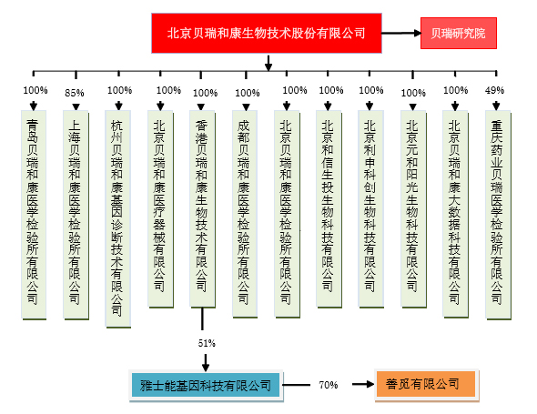此外,作为无创产前基因检测的研发先驱和行业倡导者,香港中文大学卢煜明教授持有贝瑞和康香港子公司“雅士能基因科技有限公司”18.62%的股权。 公司架构