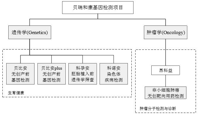 贝瑞和康的业务 贝瑞和康业务与其他基因检测公司类同,主要包括面向诊断的基因检测产品和科研服务产品。其中面向诊断的基因检测产品收入主要来自“贝比安”无创产前基因检测,此外还有基因测序仪业务。