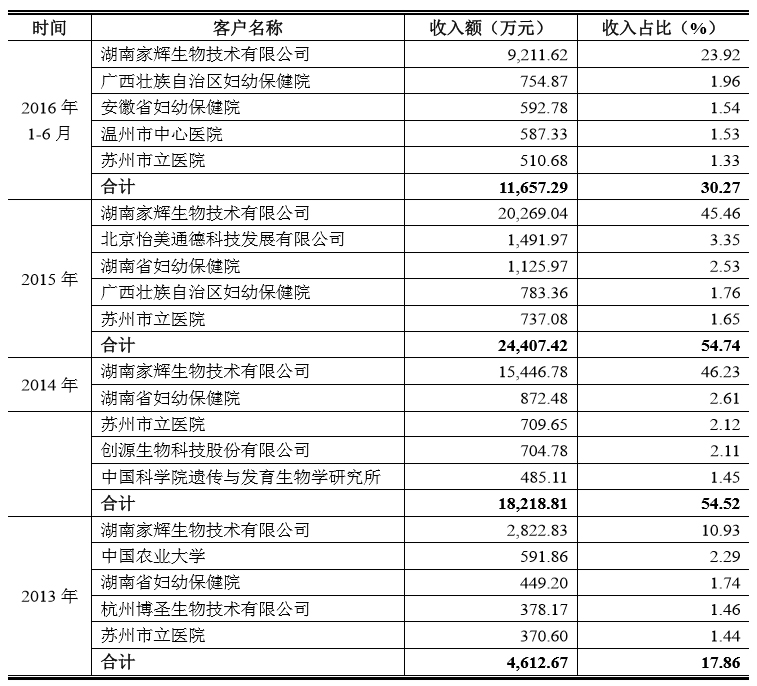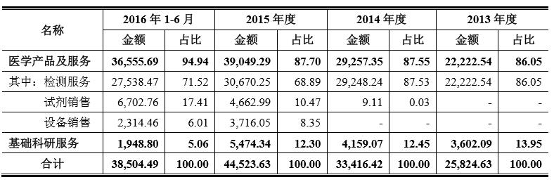 根据报告,2013年度、2014年度、2015年度和2016年1-6月,贝瑞和康营业收入分别为2.58亿元、3.34亿元、4.46亿元和3.85亿元;四个报告期的营业利润分别为0.44亿元、0.51亿元、0.50亿元和0.66亿元。 其中,主要收入来自检测服务。2016年1-6月,其检测服务的收入占比为71.52%,试剂以及设备销售的收入占比为23.42%,基础科研服务的收入占比为5.06%。 2016 年1-6 月贝瑞和康以服务模式检测样本数量约17万例,以产品模式销售试剂约7.7万例,测序仪11台,此外,2015年销售测序仪19台。