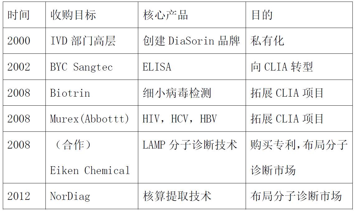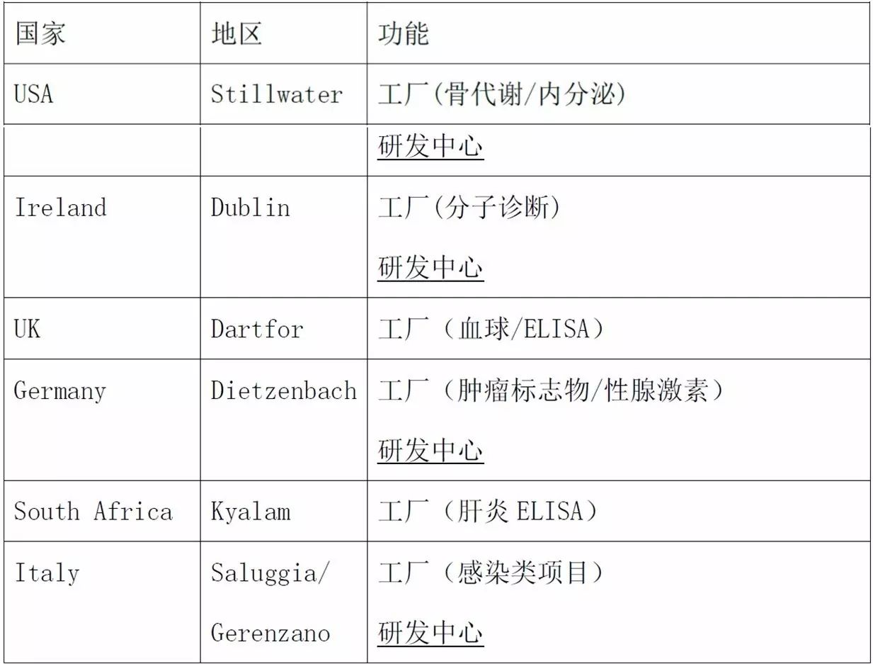 今天推出《11大IVD巨头企业发展史汇编》系列第十篇——— DiaSorin S.p.A. 1 公司概况 简介 意大利Diasorin S.p.A.创建于1968年,是全球体外诊断市场的领导者。曾是意大利Sorin Biomedica SpA的体外诊断部,2000年部门高层认购全部股票后独立出来成立DiaSorin S.p.A.,为意大利独立上市公司,作为FTSE Italia Mid Cap Index(盘中指数)的一员。具有近50年生物医学领域的研发经验,其放射免疫和酶免疫在欧洲及全球享有极高的知名度,一直致力于医院及私人实验室的免疫诊断,及分子诊断测试。 截至至2015年底,DiaSorin员工超过1600人,超过80个代理商。公司目标:Improving the health and quality of people’s lives。 部门分布 Diasorin于全球共6家工厂,5间研究实验室,27间分公司,销售网络遍布全球100+国家。 研发能力 发展历程 2 收并购介绍 3 营收情况 2015年年销售额: |