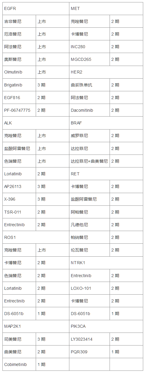![]() 肺癌患者确诊时大多已出现转移,过去化疗是延长患者生存的唯一有效方式,而靶向治疗的发展颠覆了这种状态。来自科罗拉多大学的 Hirsch 教授在 The Lancet 上对晚期非小细胞肺癌(NSCLC)的靶向治疗方案做了系统综述。 目前靶向治疗的靶点包括驱动突变、与肿瘤细胞增殖和存活密切相关的分子以及免疫检查点(参见文后表 1)。 驱动突变靶向治疗 大多数驱动突变是互斥的,每个 NSCLC 患者体内只存在其中的一种,靶向药物抑制驱动能够诱导显著的肿瘤应答,相比传统细胞毒性药物,其应答率更高、患者无病生存(PFS)和总生存(OS)更长。目前的靶向驱动突变包括常见的 EGFR 突变、KRAS 突变、ALK 易位,以及不常见的 ROS1 易位、RET 易位、BRAF 突变、HER2 突变、NTRK 易位、MET 扩增或突变。 在肺腺癌中驱动突变的比例约为:EGFR 15%,KRAS 25%,ALK 7%,HER2 2%,BRAFV600E 2%,ROS1 2%,RET 2%,NTRK1 0.5%,MET 3%,MAP2K1 0.5%,PIK3CA 1%,NRAS 0.5%。 在鳞状细胞癌中驱动突变的比例约为:EGFR 5%,DDR2 4%,FGFR1 17%,PIK3CA 14%,PTEN 18%,PDGFRA 9%,FGFR2 3%。 1. 常见的驱动突变 (1)EGFR 突变 多项大型 III 期临床试验证实 EGFR 酪氨酸激酶抑制剂(TKI)治疗 EGFR 突变阳性 NSCLC 的效果优于化疗,因此几乎所有的指南都推荐 EGFR TKI(如吉非替尼、厄洛替尼、阿法替尼)作为 EGFR 突变阳性 NSCLC 的一线治疗方案。 研究显示不同位点 EGFR 突变患者对不同的 EGFR TKI 的反应存在差异,相比传统化疗,阿法替尼能够显著提高第 19 号外显子(del19)EGFR 突变患者的 OS,而对第 21 号外显子突变无显著优势;而第 20 号外显子插入突变的患者对目前市场上所有的 EGFR TKI 都不敏感。 该研究还显示阿法替尼的疗效似乎略优于吉非替尼,二者的中位 PFS 分别为 11.0 月和 10.9 月,HR 为 0.73。因此药物的选择应该综合考虑患者的体力状态、治疗的便利性以及不良反应,如吉非替尼更易发生肝毒性反应,而阿法替尼更易发生腹泻和皮肤毒性反应。 为了提高疗效,也有研究尝试联合应用 EGFR TKI 和细胞毒药物或贝伐单抗,结果显示厄洛替尼联合贝伐单抗相比单独使用厄洛替尼能够显著提高 EGFR 突变阳性患者 PFS。 尽管单独使用 EGFR TKI 使一些患者多年保持良好的疗效,但几乎所有的患者最终会由于获得性耐药出现疾病进展。此外,研究显示吉非替尼联合铂类化疗的患者出现疾病进展后继续使用吉非替尼不能延长 PFS,因此不建议联合使用 TKI 和化疗。 临床实践中,化疗常常在 TKI 治疗出现获得性耐药时使用。对于单独使用 EGFR TKI 治疗后出现寡进展的患者,推荐局部放疗或手术切除联合 EGFR TKI 继续治疗。 (2)KRAS 突变 KRAS 突变是肺癌最常见的驱动突变,但其靶向药物的发展并不乐观。KRAS 突变有很多不同的类型,它们可能刺激不同的下游通路。此外,KRAS 突变与 TP53、STK11、CDKN2A/B 等基因突变相关,不同共突变的肿瘤具有不同的基因表达模式,比如高表达 ERBB3 和 E-cadherin 的上皮表型,或高表达波形蛋白、FGFR1 和 FRS2 的间充质表型,不同表型的肿瘤可能需要不同的治疗。 临床前研究显示成纤维生长因子受体(FGFR)拮抗剂能够抑制曲美替尼的药物抵抗,并且对于 KRAS 突变的肺癌,尤其是间充质表型的肿瘤有效。联合 MEK 和 CDK4 抑制剂,或 CHK1 和 MK2 抑制剂也在前期试验中显示出良好的疗效。 (3)ALK 易位 2007 年的统计数据显示约 3%~5% 的 NSCLC 存在间变性淋巴瘤激酶(ALK)基因易位。研究显示克唑替尼能够显著延长 ALK 阳性肺癌患者的 PFS,因而克唑替尼在美国、欧洲和日本均被批准用于肺癌患者治疗。 但克唑替尼的耐药不容忽视,其最主要的耐药机制是 ALK 继发突变,目前已知的突变包括 1151Tins、Leu1152Arg、Cys1156Tyr、Ile1171Thr、Phe1174Leu、Val1180Leu、Leu1196Met、Gly1202Arg、Ser1206Tyr 和 Gly1296Ala。 目前仍需要等待更完整的数据才能判断目前新型 ALK 抑制剂能否作为一线治疗方案或克唑替尼耐药后的二线治疗方案。 2. 不常见的驱动突变 为了改善不存在 EGFR 突变或 ALK 易位的 NSCLC 患者的预后,研究者识别出了很多新型驱动突变,作为治疗的靶点。 (1)ROS1 易位 NSCLC 患者中约有 1%~2% 存在 ROS1 基因易位,以腺癌、年轻患者、不吸烟者为主。克唑替尼已被 FDA 批准用于 ROS1 阳性 NSCLC 患者的治疗。色瑞替尼、卡博替尼等 ROS1 抑制剂仍在临床试验阶段。 (2)RET 易位 NSCLC 患者中约有 1%~2% 存在 RET 基因易位,不吸烟者、年轻腺癌或鳞癌患者中多见。多靶点 TKI 对 RET 激酶有效,如凡德他尼、卡博替尼、盐酸阿雷替尼、阿帕替尼等,目前处于临床 1 或 2 期试验阶段。 (3)BRAF 突变 BRAF 是 KRAS 下游的重要信号分子,能够激活 MAP 激酶通路。约 2% 的肺癌患者存在 BRAF 突变,尤其是吸烟的腺癌患者多见,其中一半为 BRAFV600E 突变。BRAF 抑制剂能够使 RAS 信号代偿性增加,因此研究者观察了 BRAF 抑制剂联合 MEK 抑制剂的疗效,结果显示 BRAFV600E 突变阳性肺癌患者联合用药的应答率更高,非 BRAFV600E 突变患者的治疗仍有待进一步研究。 (4)HER2 突变 1%~2% 的 NSCLC 患者存在 HER2 突变,女性、不吸烟者和腺癌多见。目前针对 HER2 突变的靶向治疗药物的效果存在争议,有待进一步研究。 除了上述突变之外,NTRK 易位和 MET 扩增或突变也可见于肺腺癌,而鳞状细胞癌的驱动突变报道较少,目前已知的包括 FGFR1 扩增和 DDR2 突变。 肿瘤细胞增殖和存活相关的重要分子 主要包括 EGFR 单克隆抗体和抗血管生成剂: EGFR 信号通路在肺癌形成过程中发挥着重要作用,EGFR