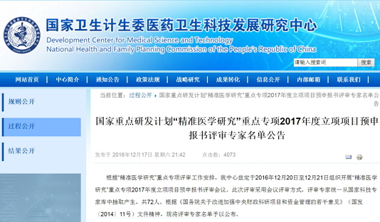 根据“精准医学研究”重点专项评审工作安排,国家卫生计生委医药卫生科技发展研究中心兹定于2016年12月20日至12月21日组织开展“精准医学研究”重点专项2017年度立项项目预申报书评审会议。此次评审采用会议评审方式,评审专家统一从国家科技专家库中抽取产生,共72人。根据《国务院关于改进加强中央财政科研项目和资金管理的若干意见》(国发〔2014〕11号)文件精神,现将评审专家名单予以公布。