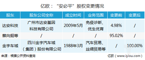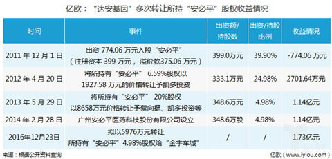据了解,安必平于2005年7月在广州成立,由蔡向挺、周蕾和康顺医学出资成立,股权经多次转让,而后在相关媒体报道中,安必平的股东中出现达安科技。达安基因在公告中披露,用774.06万元,投资入股安必平,占股39.90%。达安基因表示,增资扩股安必平是其实施产业链发展战略的具体体现,拓展了公司在诊断试剂产业的产品线,并提高了公司HPV检测试剂在专业化细分市场的竞争力。 “达安基因”是我国分子诊断试剂行业的龙头企业,1988年创立,法定代表人为何蕴韶,2004年在深圳证券交易所创业板挂牌上市,品牌价值168亿元,拥有达安基因、达安健康、大瑞生物、中山生物等多个品牌。目前,达安基因构建了核酸诊断技术平台、测序诊断技术平台、免疫学诊断技术平台、细胞学诊断技术平台、生化诊断技术平台和其他新兴诊断技术平台并行发展的技术和产品研发体系,拥有卫生部医药生物工程研究中心、国家地方联合工程实验室及省市技术研发中心,同时拥有两百多项医疗器械注册证,并拥有上百项发明专利。 而“金宇车城”成立于1988年3月,1988年成功转型为上市公司,法定代表人为刘波,是国内较早从事丝绸贸易的企业,主营业务覆盖生产、销售丝织品、房地产开发经营、汽车贸易、物业管理等。近几年,金宇车城展开布局,逐步形成以丝绸贸易、汽车销售、房地产开发、物业管理和体外诊断为核心的新业务发展战略。 ▋达安基因多次转让安必平股权,目的何在? 据2016年12月23日金宇车城披露的《发行股份及支付现金购买资产并募集配套资金暨关联交易预案》可知,达安基因自2010年12月23日,以774.06万元投资入股安必平后,股权经多次转让,具体收益情况如下表: