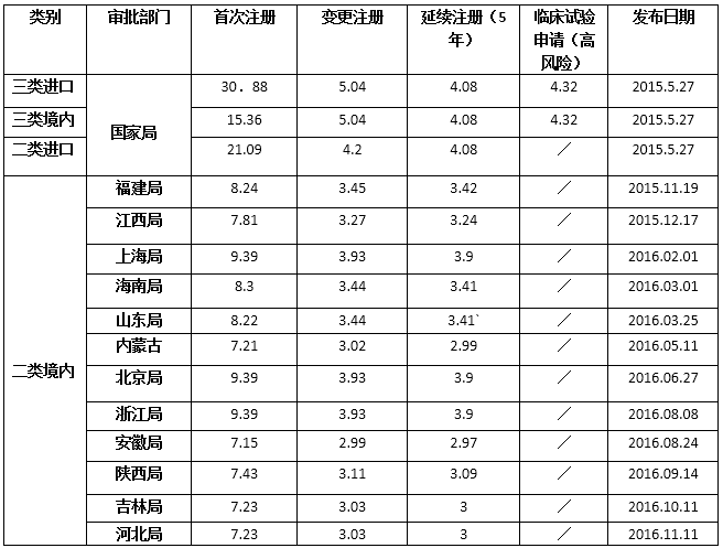 继近日江苏省出台医疗器械注册收费标准(江苏省医疗器械产品(二类境内)注册收费标准首次注册为84500,变更注册为35300元,延续注册(五年一次)为35100元)后,日前,宁夏食药监局发布了关于药品、医疗器械产品注册收费公告,其中,对于医疗器械的收费标准,公告显示,宁夏自治区医疗器械产品(二类境内)注册收费标准首次注册为31300元,变更注册为13100元,延续注册(五年一次)为13000元,并明确该标准将从2017年1月1日起执行,试行期2年。以下是具体收费标准: