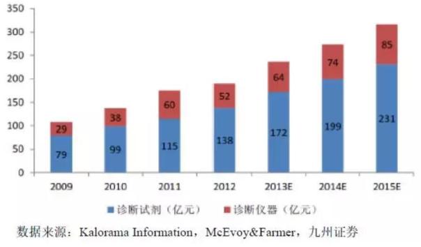 7、体外诊断试剂行业的发展现状 体外诊断能在疾病早期快速、准确地获取诊断信息,用于健康评价、疾病诊断治疗和疾病监测等用途。 根据联合市场调研(Allied Market Research,AMR)发布的报告,全球体外诊断行业2013年的市场规模为533亿美元,在未来几年内将以5.34%的年复合增长率增长,预计2020年将达到747亿美元。 目前国内体外诊断试剂生产企业约为300家至400家,其中规模以上企业近200家,但年销售收入过亿元的企业仅约20 家左右,企业规模普遍较小、产品品种单一,行业竞争激烈。 国内体外诊断市场的集中度较高,约有60.00%的市场份额被6家外资体外诊断厂商(罗氏、西门子、雅培、贝克曼、BD、希森美康)占据。 根据Kalorama Information与McEvoy&Farmer的分析测算,2015年我国体外诊断行业的市场规模预计为316亿元,其中,体外诊断试剂的市场规模将达到231亿元。发达国家体外诊断相关产品的人均年消费金额为25-30美元,而中国体外诊断产品的人均年消费金额仅为2~3美元,存在较大的差距。 随着人民生活水平的提高,健康医疗需求也在不断增加;同时伴随人口老龄化程度的加剧以及政府的持续投入,医疗卫生保障制度的改革将使得上述潜在需求得以释放,因此,国内体外诊断市场的增长空间广阔,预计未来数年内将保持15%~20%的增长速度。 国内体外诊断行业的市场规模如下图: