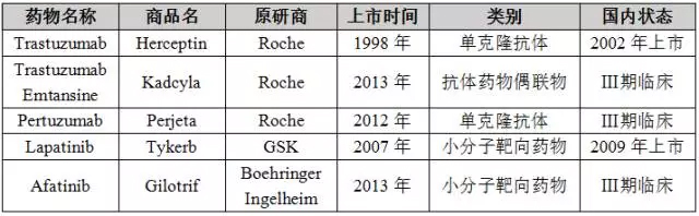 人类表皮生长因子受体2(human epidermal growth factor receptor-2,HER2),即c-erbB-2基因,因无可溶性的配体而被称为“孤儿受体”。该受体的聚合作用会导至酪氨酸残基磷酸化,并启动多种信号通路导至细胞增殖和癌症发生。据临床统计,15%~30%的乳腺癌和10%~30%的胃/食管癌会发生HER2基因扩增或过表达。此外,在卵巢癌、肺癌、膀胱癌、头颈癌中也发现HER2基因的过表达。近年来,针对HER2靶点设计的药物一直是研究的热门,目前已上市的HER2靶向药物有5种,其中两种在中国上市。 表1. 全球已上市的5种HER2靶向药物