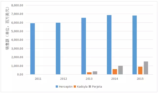Roche表现突出 在HER2靶点药物的开发上,Roche表现突出。目前已上市的5种HER2靶向药物中,有3种由Roche研发,分别是Herceptin、Kadcyla及Perjeta。 Herceptin是治疗HER2阳性乳腺癌的一线用药,于1998年在美国上市,是最早上市的HER2靶向药物。从2011-2015年的全球销售额可以看出,Herceptin是Roche的3种HER2靶向药物中的拳头产品,销量远胜于其他两个品种,2015年全球销售额更是达到了68亿美元。但是2015年Herceptin专利到期,大量仿制药涌现,导至Herceptin的市场规模开始萎缩。 Perjeta可阻断HER2受体的二聚化,与配体的结合位点与Herceptin不同,是乳腺癌的二线治疗药物。Perjeta最初由Genentech研发,2009年Roche收购Genentech,并获得Perjeta。2012年,Perjeta在美国获批,全球销售额快速增长,2015年全球销售额为15亿美元。Perjeta目前在我国尚处于Ⅲ期临床阶段。 Kadcyla是由trastuzumab和细胞毒性药物组成的抗体药物偶联物,可以靶向HER2过表达细胞以克服耐药机制。Kadcyla于2013年获批上市,2015年全球销售额已达到9亿美元以上。同Perjeta一样,Kadcyla在我国尚处于Ⅲ期临床阶段。 图1. Roche已上市的3种HER2靶向药物全球销售额