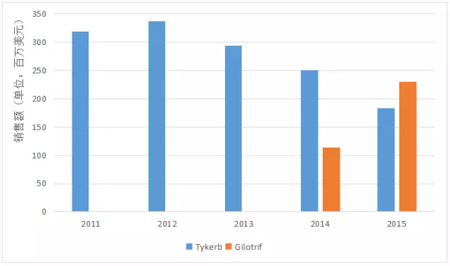小分子靶向药物市场规模较小 已上市的HER2靶点药物中,还有2种小分子靶向药物,分别是Tykerb和Gilotrif。 Tykerb由GSK研发,是一种口服小分子表皮生长因子酪氨酸激酶抑制剂,于2007年在美国上市,2013年获批进入中国市场。近年来Tykerb市场规模逐渐萎缩,到2015年,全球销售额仅不到2亿美元。 另外一种小分子靶向药物Gilotrif,由Boehringer Ingelheim研发,于2013年在美国上市,并通过了FDA孤儿药认定。Gilotrif上市后市场表现良好,2015年全球销售额已超过Tykerb。 图2. 2种小分子HER2靶向药物全球销售额