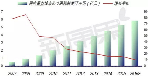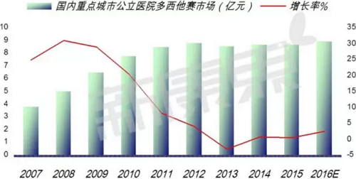 曲妥珠单抗由美国基因泰克公司开发成功,1998年9月25日获得美国FDA的审批用于临床,商品名Herceptin(赫赛汀)。罗氏并购基因泰克后,已是罗氏qixia的单抗药物。曲妥珠单抗的靶向性生物基因疗法与普通的放疗、化疗、激素治疗乳腺癌相比,可通过基因选择针对性地杀伤恶性肿瘤细胞,而不影响人体正常组织细胞的生存。 曲妥珠单抗(Trastuzumab)是一种重组DNA衍生的人源化单克隆抗体,是具有代表性的抗肿瘤靶向抗体药物。能选择性地作用于人表皮生长因子受体-2的细胞外部位,与其受体特异性结合,影响生长信号的传递;并促进受体蛋白的内在化降解,通过聚集免疫细胞攻击并杀死肿瘤细胞,临床用于晚期乳腺癌的治疗。目前,欧盟已批准赫赛汀与多西他赛联用,作为人类表皮生长因子受体2(HER2)呈阳性的转移性乳腺癌的一线治疗联合用药。 2002年,曲妥珠单抗已引入我国医院市场,以商品名“赫赛汀”上市。目前国内曲妥珠单抗市场由赫赛汀独占。 数据显示,2016年1-3季度重点城市公立医院曲妥珠单抗用药销售金额达4.41亿元,预示2016年在我国重点城市公立医院曲妥珠单抗用药销售金额达5.88亿元,同比上一年增长了11.07%。赫赛汀药物毒性低,治疗效果表达明显,生存时间延长,对提高晚期癌症患者生活具有积极意义,是带动抗肿瘤单抗市场增长的动力。 国内亮丙瑞林长足迈步