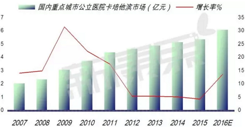 多西他赛属于微管解聚抑制剂(Docetaxel,多烯紫杉醇),是紫杉烷类化合物,由法国罗纳普朗克·乐安公司最早研制开发,用于治疗晚期乳腺癌和非小细胞肺癌。在美国M.D.Anderson肿瘤中心进行的Ⅱ期临床试验中发现,多西他赛对应用顺铂和卡铂失败的晚期卵巢癌患者有较好疗效,而且多西他赛对前列腺癌、胰腺癌、软组织肿瘤、头颈部癌、胃癌、食管癌等实体肿瘤均有显著活性。 多西他赛在美国、日本等80多个国家相继上市,1996年进入我国开始临床验证后上市。江苏恒瑞在国内已开发获准上市,目前恒瑞的多西他赛在医院的销售额已经超过进口药物,成为销量最大的商家。 最新数据显示,2016年1-3季度重点城市公立医院多西他赛销售金额达6.75亿元,预示2016年全年多西他赛用药金额达8.99亿元;同比上一年增长2.79%,远高于同类品种,虽然目前的总销售额落后于紫杉醇,但是增速较快,赶超紫杉醇成为同类药中的老大指日可待。2016年重点城市公立医院多西他赛TOP5生产厂商江苏恒瑞占据40.72%、赛诺菲占据29.74%、山东齐鲁占据15.56%、深圳万乐占据8.39%、奥赛康占据2.04%。 卡培他滨快速上升