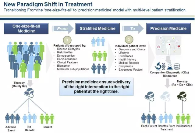 过去,医药都是在一类人群上进行试验却将之推广应用于所有患者,这种「一体适用」的模式将逐渐消亡。精准医学为医疗服务行业提供了范式转变的可能——不再需要依靠猜测进行工作、不再囿于多变的诊断方法、也不再采用基于广泛人口统计的治疗策略。精准医学能够提供的方法是可靠的,他们被现有的数据所佐证,从而帮助患者从更加全面的视角审视自己的疾病。 通过靶向治疗将精准医学应用于主流的临床工作最终会极大地促进疾病的预测和预防。医生可以通过差异性诊断减少当下医疗行业存在的低效现象。这些低效现象——假阳性、假阴性、不必要的治疗以及过度用药或药量过少等等——都对医药公司经济收益水平和医疗服务质量有很大的影响。图一阐释了精准医学在治疗手段上带来的范式改变: