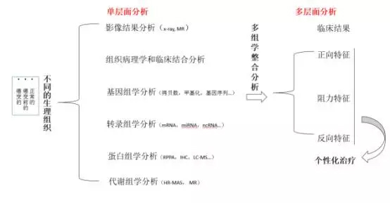 国际肿瘤基因组协会(ICGC)项目实际上测了两万例的全基因组或全外显子组数据,还有很多表达芯片,甲基化芯片等数据。肿瘤基因组大数据分析包含几个阶段,从最初的数据分析、序列比对、突变探测到突变的重现性分析分类,及功能注释等过程。 目前国际上倾向于多组学的整合分析。从基因组、表达谱、蛋白及代谢组水平上再结合影像学,病理切片等数据进行整合分析: